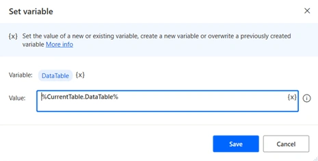 Create a variable containing the datatable that has been extracted. This isn't necessary, however I personally find it easier to dump into a named variable, so that I can recall it later in the process.