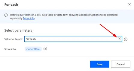Once we have extracted the list of files that we want to read, we then need to loop through each file and take actions. To do this, use the for each action, then click on the x option to bring in a variable and choose the “Files” option from the previous step:
