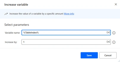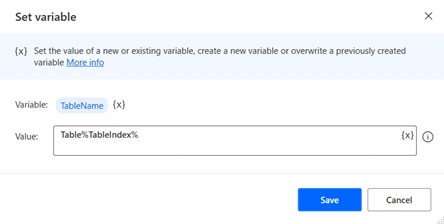 Finally, inside but at the end of the current table loop (Step 6 from the above), add an increase variable on the table index. This number is appended into the TableName variable (Step 8) so that we can keep track of the table being inserted into the SQL table. If you look at the query in step 14, the second value is this table name (‘%TableName%').