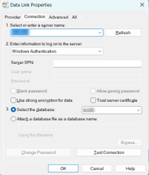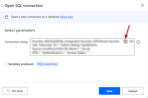 Open connection to your database using this action. To create the connection, click on the build connection string option: