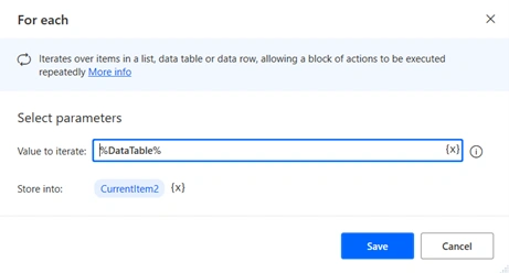 I now drop into a loop for every item (row) within the datatable. This means that the process will look at each item in the datatable and allow me to take an action on each item:
