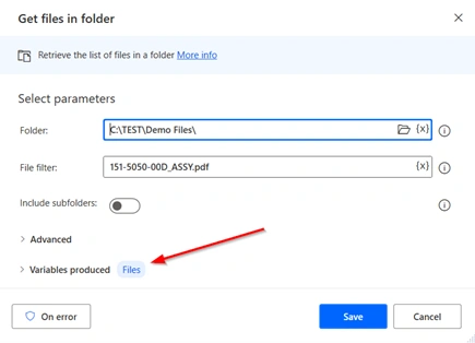 Please note how the this step produces a variable called “Files”. Lots of steps within a PA Desktop flow will generate a variable output, which can be renamed if you choose.