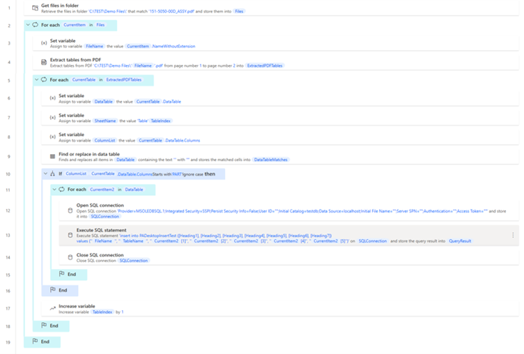Now that we have the file and have extracted the tables, the next step is to loop through the tables in order to process the information contained within them. This is in essence no different from the first For each we used, except this time you are looping though the PDF table: