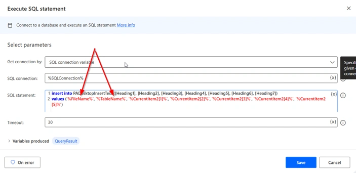 Please also note that the SQL syntax requires that the value to be inserted be enclosed in single quotes. Therefore, to insert the a value for the CurrentItem2 variable, it will need to look something like ‘%CurrentItem2[1]%'
