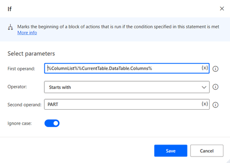 This step is again not strictly necessary. However, in my file, I have multiple tables, only one of which I am interested in. Therefore I am using an if statement to check whether the ColumnList variable contains the header columns for the table I want: If it does, I do the following, if not, I do nothing.
